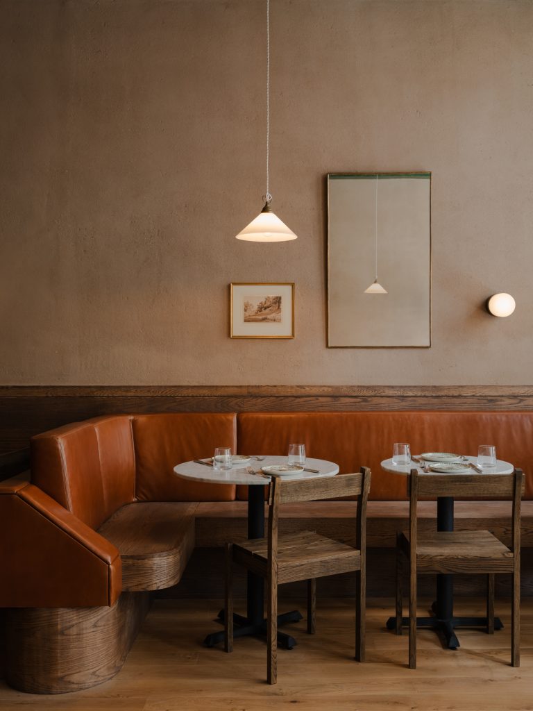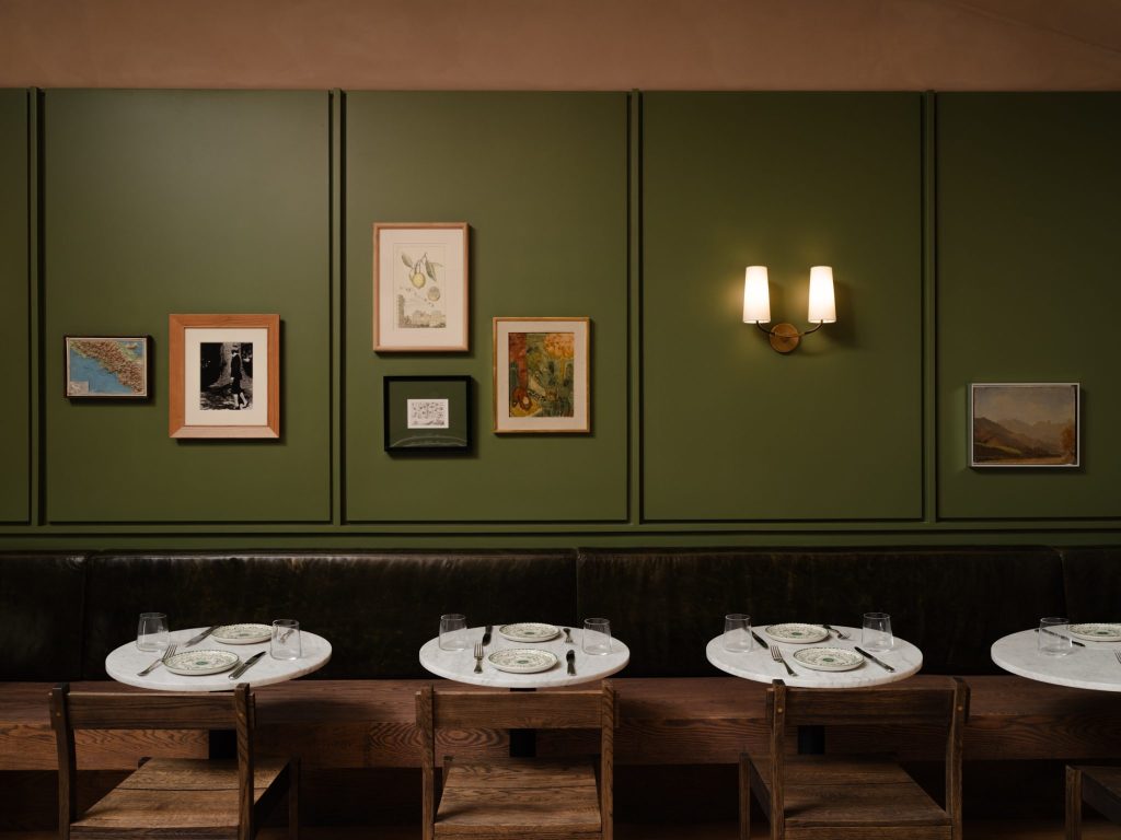 At the center of Massara’s design is a 4-meter-high atrium where natural light highlights key features such as a custom-built rough-stone wood-burning pizza oven, a long Carrara marble counter, and a communal table constructed from beams salvaged from the building’s original 1900s structure. Yet, Secchi makes it clear: Massara is not a pizzeria. While Rezdôra is rooted in the rich, dairy-laden cuisine of Emilia Romagna, Massara embraces the flavors of Campania—focusing on vegetables, olive oil, seafood, and live-fire cooking. The interior of Massara channels a rustic Italian farmhouse, with walls adorned sparingly with brass and bronze light fixtures, vintage prints, and books sourced from Italy. Murano glass pendants add a touch of elegance, complementing the “eclectic farmhouse” vibe that Secchi and his team sought to create.