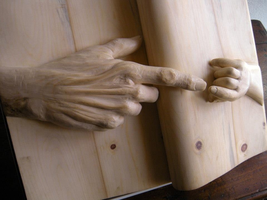 Through her passion, she discovered wood and the possibilities this material offers for expressing her artistic talent. Made in a variety of techniques, her sculptures see the wood transformed into books from which emerge hands that try to escape the confines of the pages, faces that seem to whisper their story, trapped within the pages.