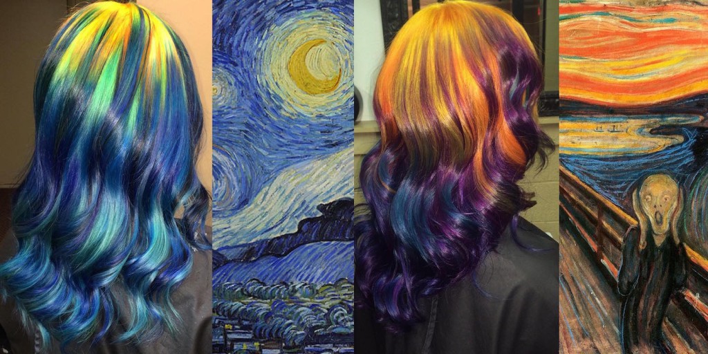 Ursula Goff uses hair as a canvas, painting with hair dyes inspired by famous artists. On her website, you can see numerous works featuring colors reminiscent of the ocean, galaxies, rainbows, and fire. In a recent series, the artist drew inspiration from paintings by famous artists, aiming to replicate the colors of the original artwork as closely as possible in the hair. The artists reinterpreted in her colorful hair designs are numerous, including Kandinsky, Van Gogh, Warhol, and many others.