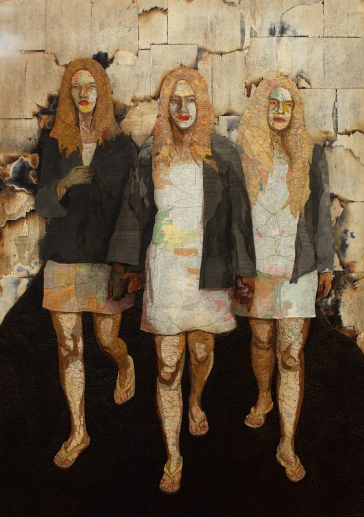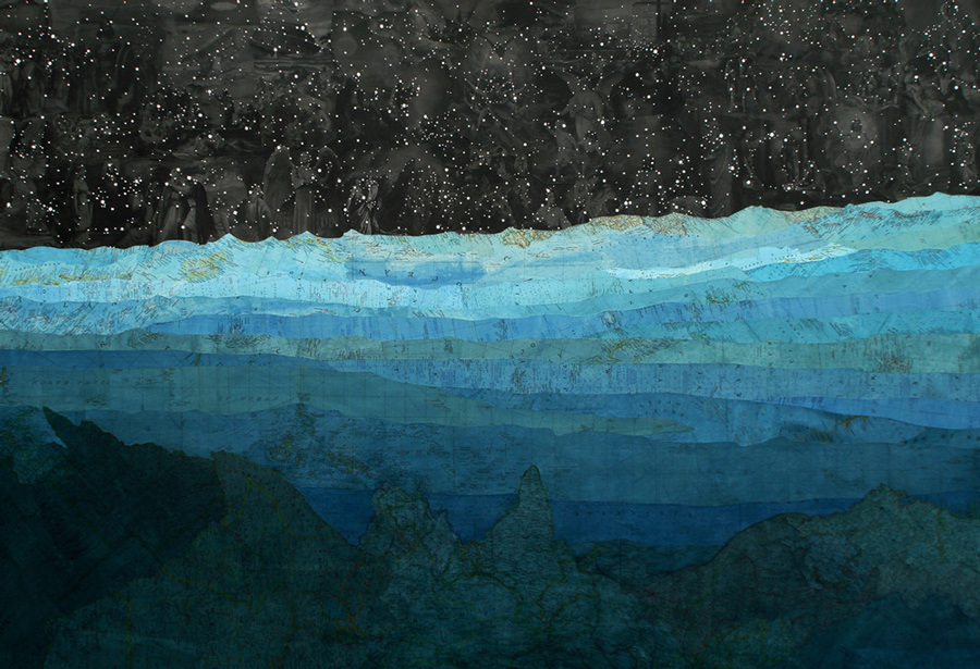 Matthew Cusick’s latest series of paintings at the Lisa Dent Gallery feature Texas highways traversing allegorical landscapes, created by meticulously crafting maps as a substitute for paint. By integrating historical maps with modern highway imagery, Cusick explores the complex narrative of America’s geopolitical and infrastructural evolution, revealing the tension between natural beauty and the environmental impact of human ambition.