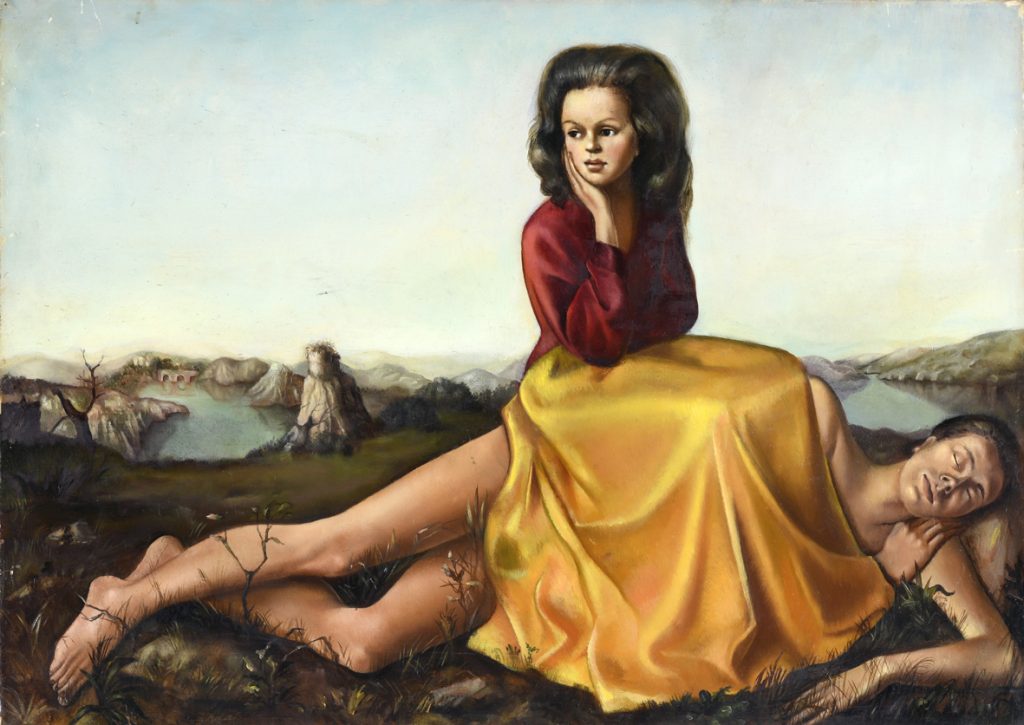 Leonor Fini, Femme assise sur un homme nu, 1942, oil on canvas © Leonor Fini, by SIAE 2024